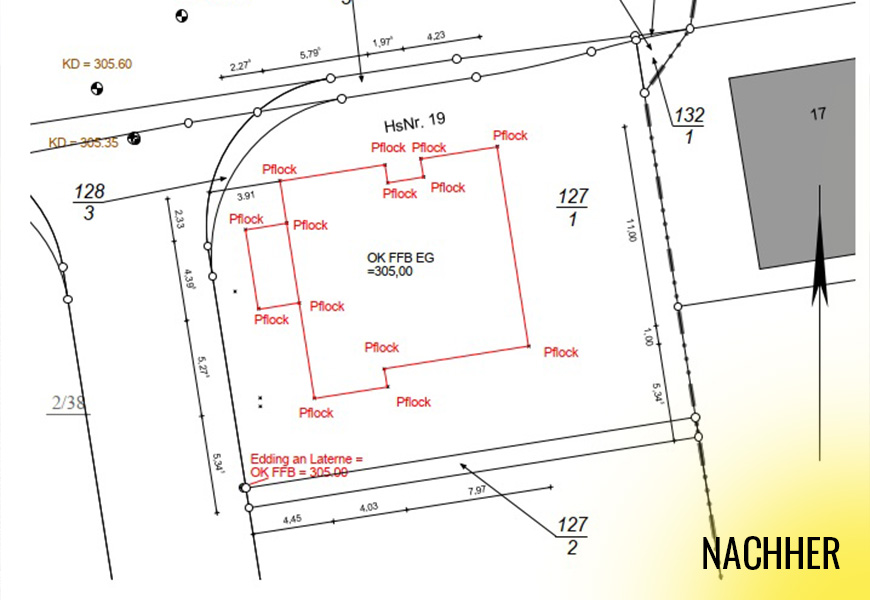 • kostengünstige Grobabsteckung der neuen Gebäudeecken vor dem Ausschachten, um Ihnen einen optimalen Baustart zu ermöglichen